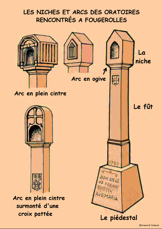 On appelle généralement “oratoires“ et plus précisément “poteaux oratoires“, les édifices en pierre composés d'un piédestal, d'un fût et d'une niche, élément caractéristique de ce type de monument et dans laquelle est déposée une statuette de la Vierge ou du Christ. La niche comporte un arc, qui peut différer dans sa forme, d'un oratoire à l'autre. Toutefois, on désigne aussi sous le nom d’“oratoires“, à défaut de termes appropriés, différentes manifestations de dévotion religieuse pouvant prendre l’aspect de stèles, de petites constructions couvertes, de niches en façade, dans un rocher ou dans un tronc d’arbre. Selon l’inventaire fait par l’ADEF en 2012, pour son ouvrage « Fougerolles, La Vaivre, à la croisée de nos chemins », nous comptons sur la commune 21 édifices regroupant tous ces aspects. Retour vers Patrimoine architectural |